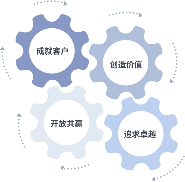 成就客户是一切决策的出发点,,,,创造价值是衡量所有工作的标准,,,追求卓越是我们做事做人的态度,,开放共赢是我们的格局也是最终的结果。。价值观的齿轮环环相扣,,推动着组织里的每个人不断向前。。
